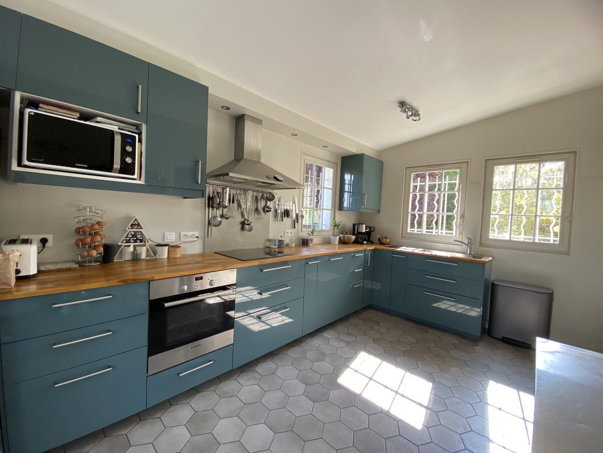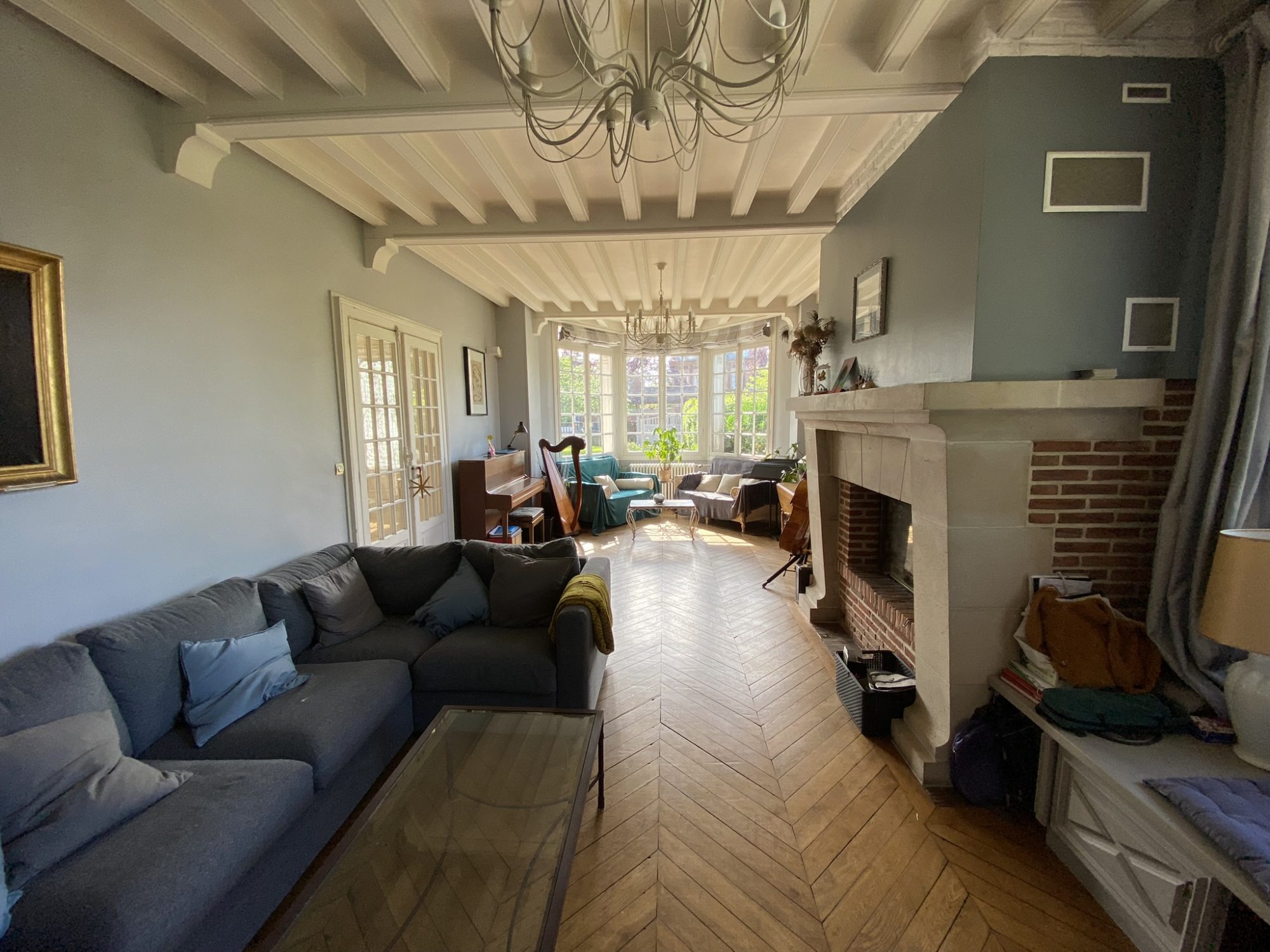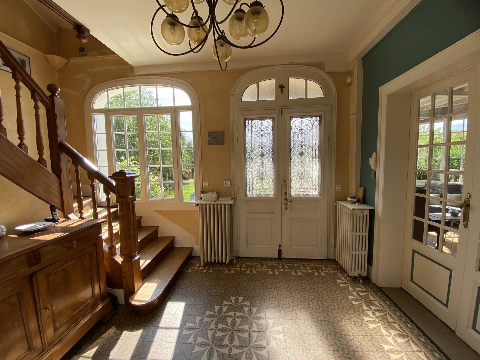 Une magnifique entrée avec carreaux de cimentUne superbe cuisine aménagée / équipée ( Four, Plaques, Lave vaisselle, Hotte, Micro-onde…) Un salon séjour et son Bow Window lumineux avec cheminée à insert.Une spacieuse salle à mangerUn WC