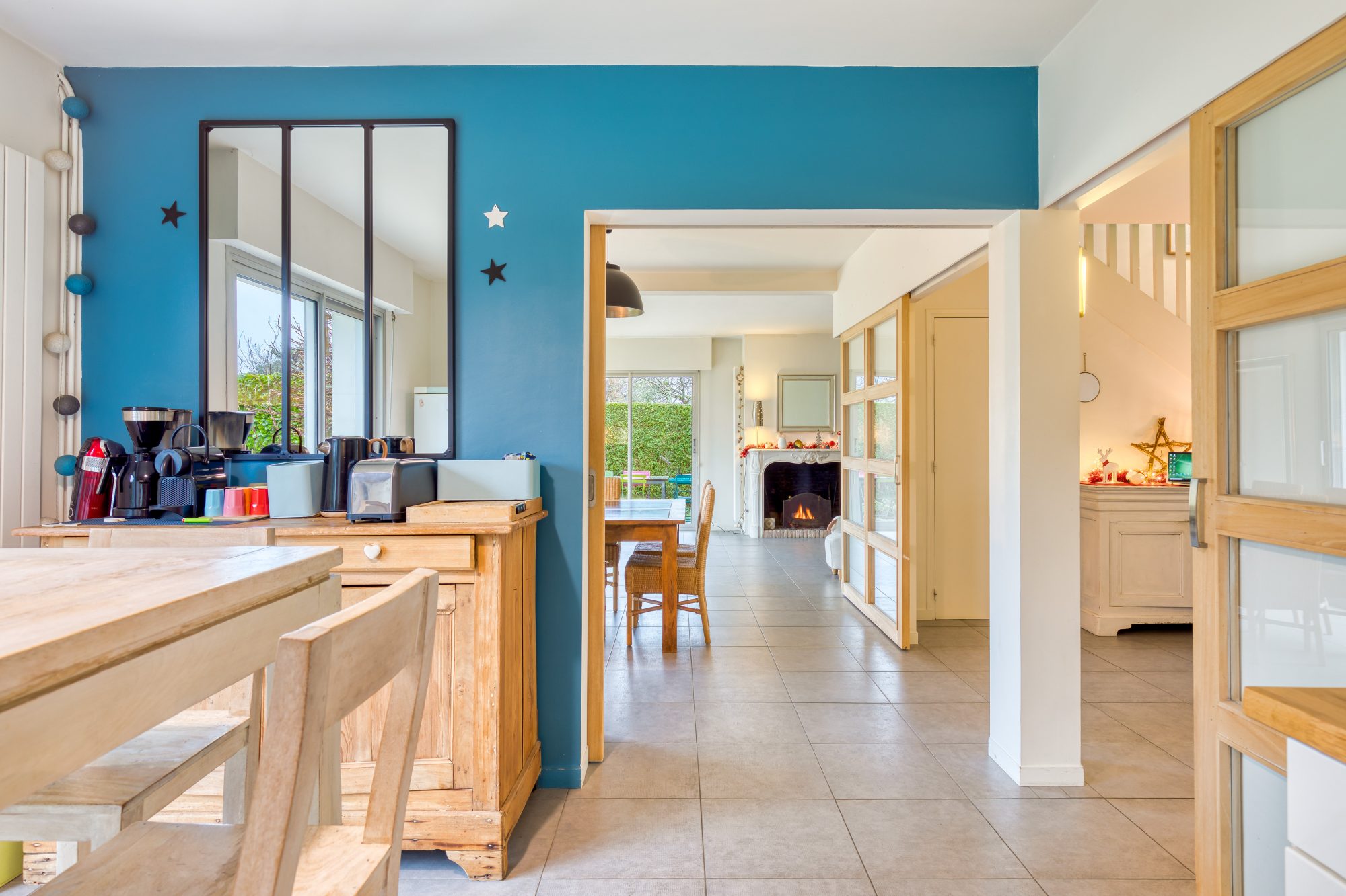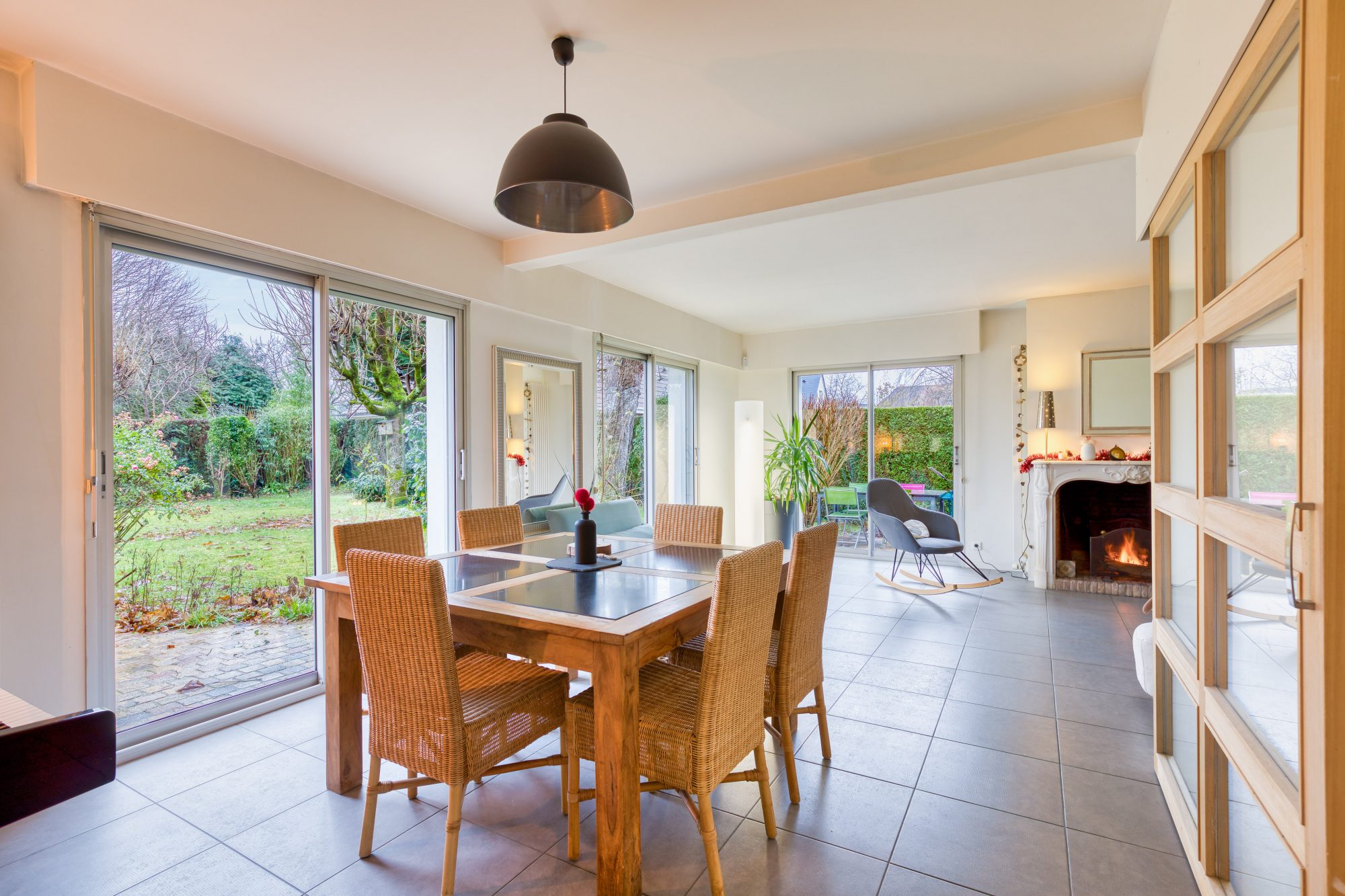 • Un séjour-salon de 38 m² avec cheminée à foyer ouvert et avec accès à la terrasse