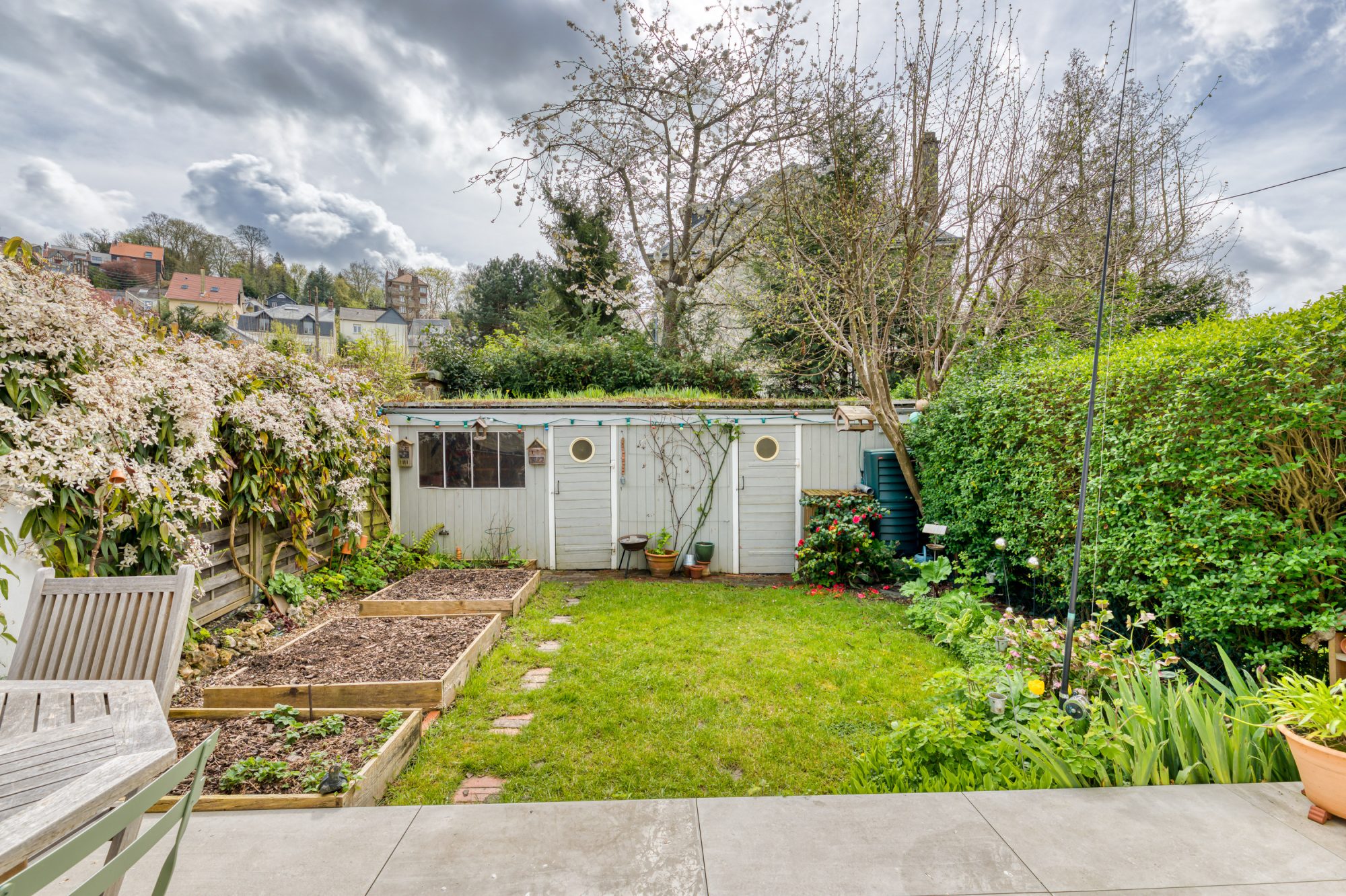 En extérieur : un abri de jardin, une terrasse plein SUD, un magnifique jardin arboré.