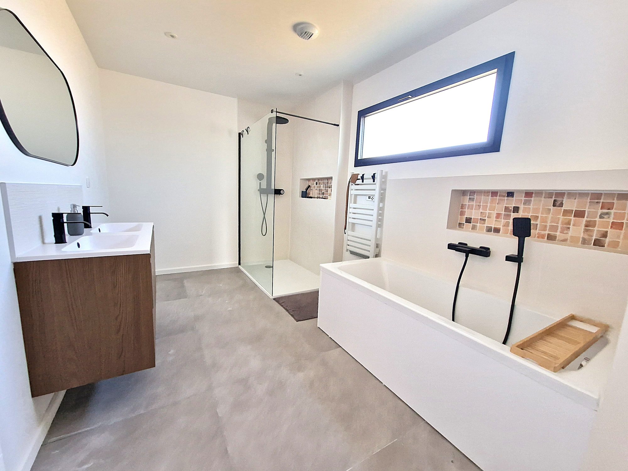 Un palierUne mezzanine de 31 m² ( peut être transformée en chambre )Une chambre de 19 m² avec accès à la terrasse de 92 m²Une chambre de 17 m² avec accès à la terrasseUne chambre de 16 m²Une salle de bains de 13 m²Un WCInformations techniques : | DPE A | Chauffage Pompe à chaleur | Plancher chauffant RDC et étage | Double vitrage | Domotique sur menuiserie, portail et portillon | Alarme et caméra | Arrosage automatique | Adoucisseur d’eau | Prise voiture électrique | Engazonnement en cours | Exposition SUD | ASSURANCE dommage ouvrage | Possibilité d’agrandissement surface plancher 300 m² |