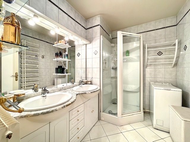 – Une salle de douche avec double vasque, sèche serviette et un WC séparé