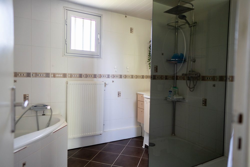 – Une salle de bain avec douche et baignoire