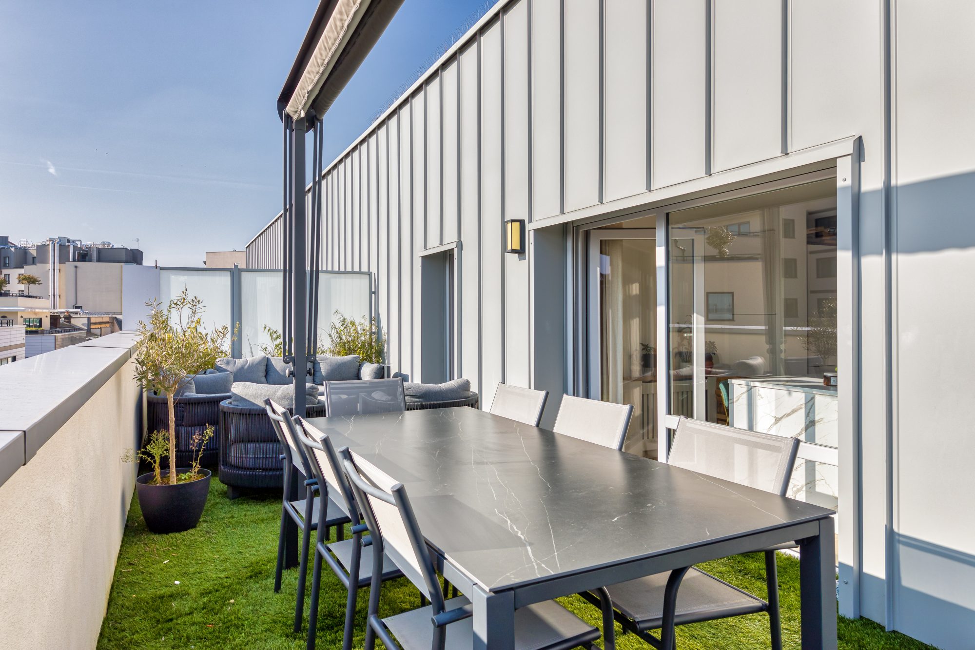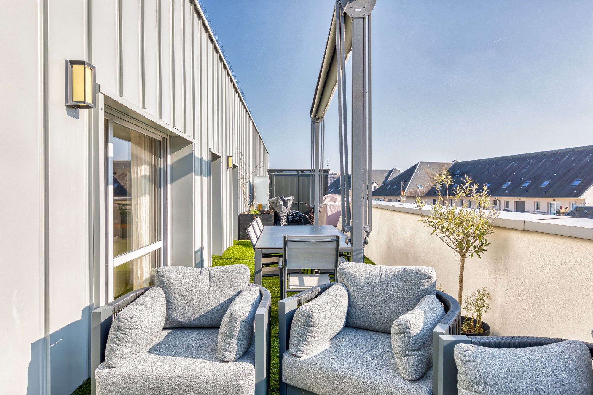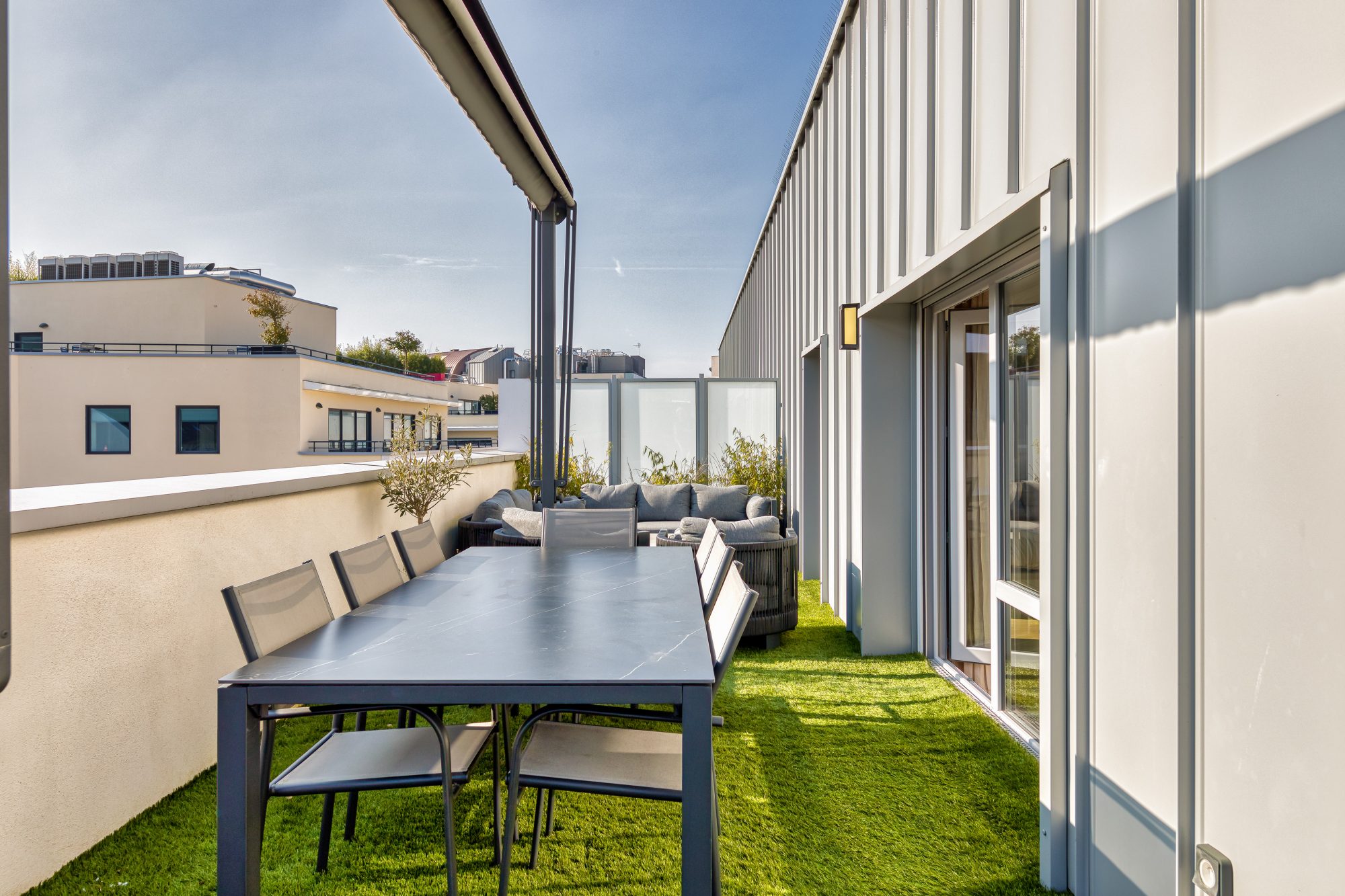 ° 1 grande terrasse de 42 m² avec un revétement en herbe synthétique de très belle qualité, un store auto lesté et abris de jardin