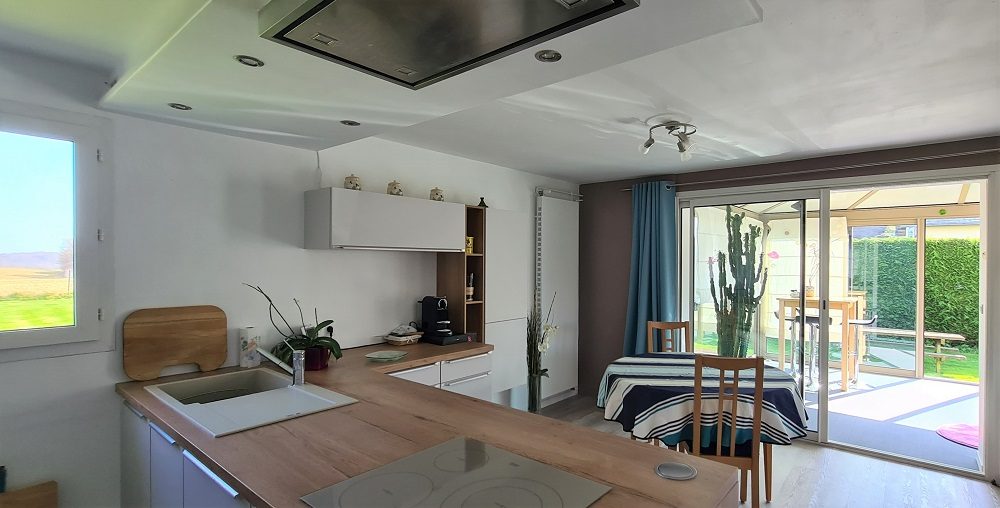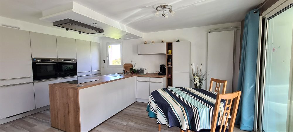– Une cuisine ouverte aménagée et équipee récente avec ilôt central