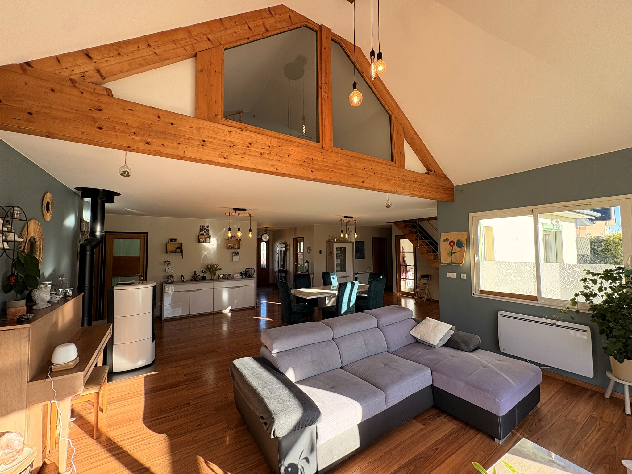 Vous apprécierez également la présence d’un grand grenier, un double garage et des prestations de qualité : huisseries double vitrage, VMC, fibre optique, chauffage individuel électrique performant (DPE C, GES A), poêle à granules et une taxe foncière maîtrisée.