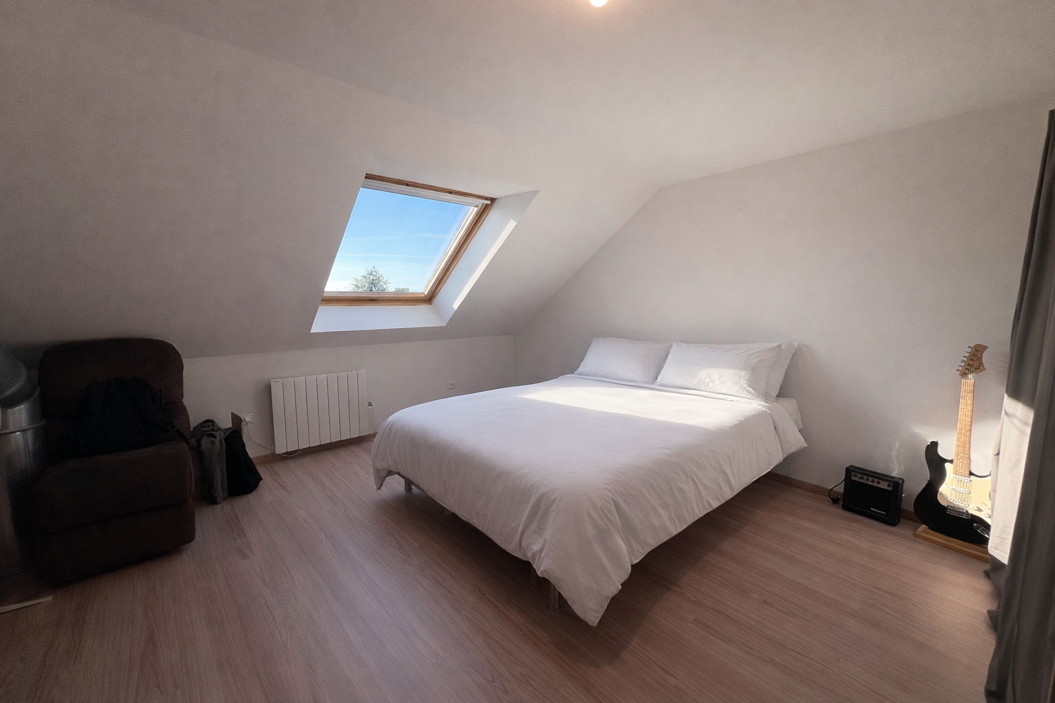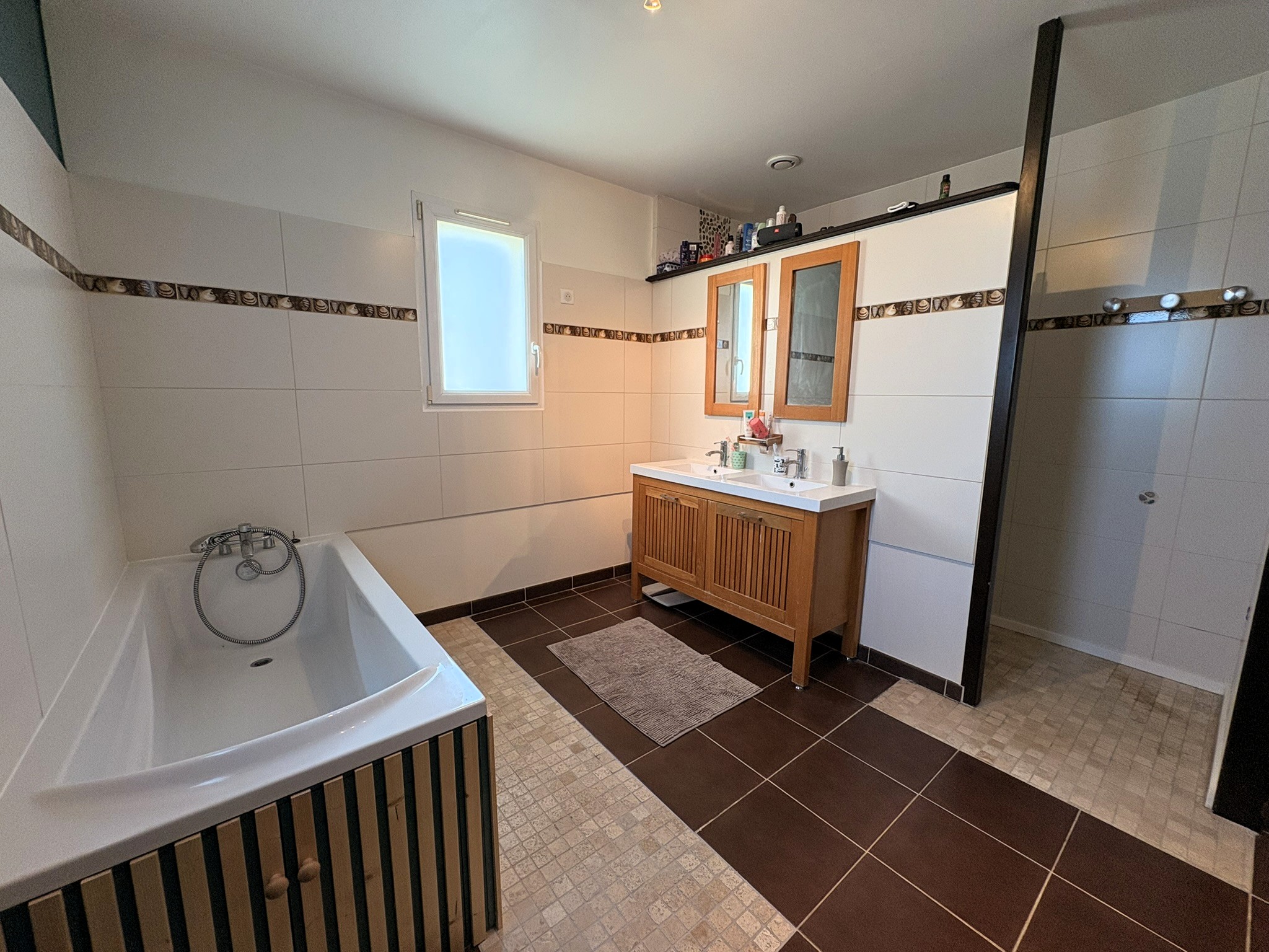 La cuisine indépendante, moderne et fonctionnelle, dispose d’un accès direct sur l’extérieur : pratique pour les repas d’été et le quotidien. Côté nuit, la maison compte 5 chambres, dont trois en rez-de-chaussée, permettant une vie de plain-pied, idéale pour l’accueil d’amis ou de la famille. Une grande salle de bain avec baignoire, double vasque et douche, ainsi qu’un WC indépendant complètent le confort familial.
