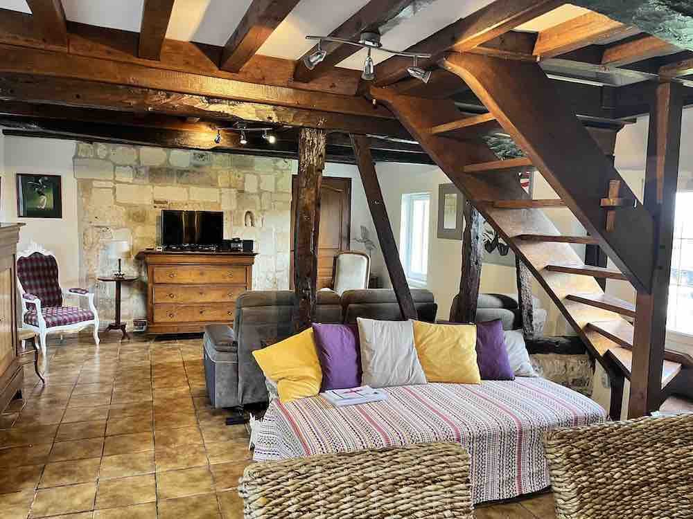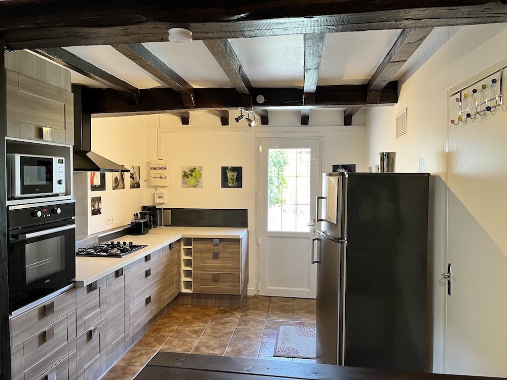 – Une cuisine équipée, ouverte sur salle salon avec une cheminée.
