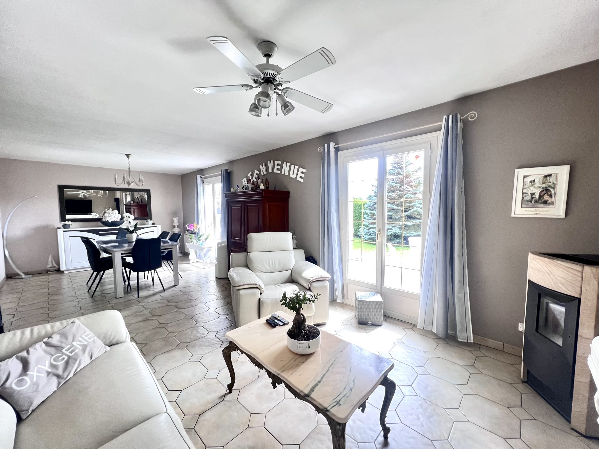 – Un séjour/salon de 32 m² avec poêle à granules donnant sur une terrasse et jardin