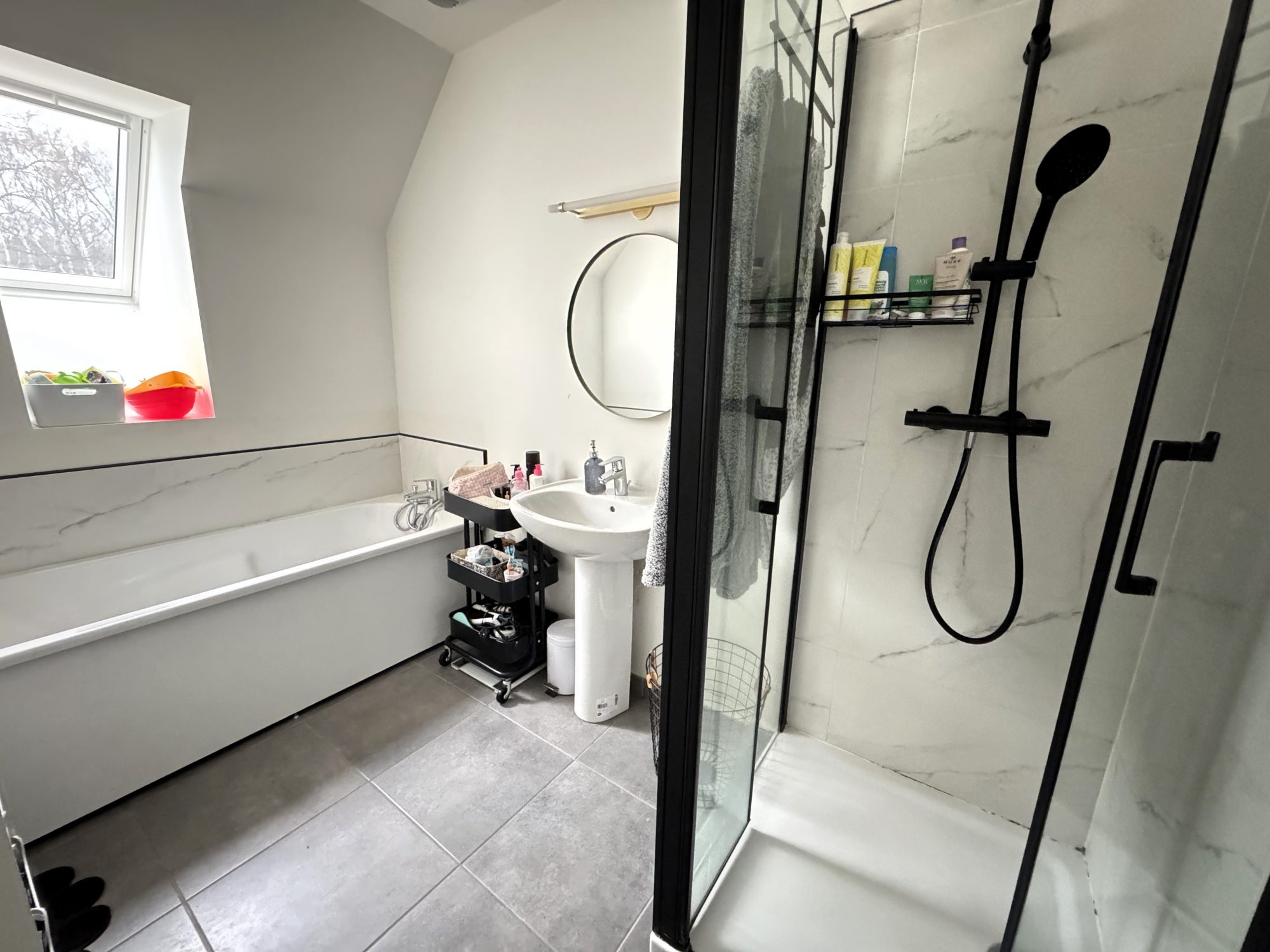• Une salle de bains avec douche et baignoire